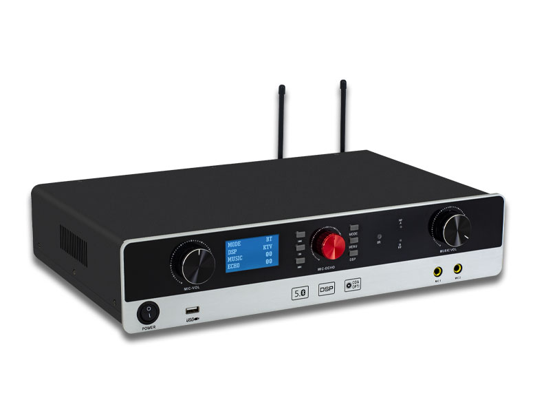 10、MIC输入:自带两个U段无线MIC,防啸叫、防干扰,另有2个MIC接口。