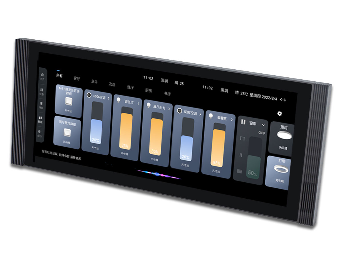 2、安装尺寸:172*75*60mm3、电压:110-240V4、 物联网平台:涂鸦 TUYA物联网5、AI语音:思必驰四麦语音,8-12米范围内精准识别语音指令6、物理旋钮:可调节空调、窗帘、灯光调光调色等7、 8英寸IPS显示器,8、 4核CPU 2+8G内存,,9、 蓝牙支持10、 输出功率:2*30W输出11、 智能家居:内置Tuya ZIGBEE模块,所有连接到Tuya的智能家居都可以控制。。12、 支持485双向控制13、 输入输出:支持TF卡、OTG U盘、本地播放、音频输入输出1路、低音输出1路14、 支持触发门铃遥控操作15、 互联网连接:WIFI、RJ4516、 支持断电记忆、多档定时开关